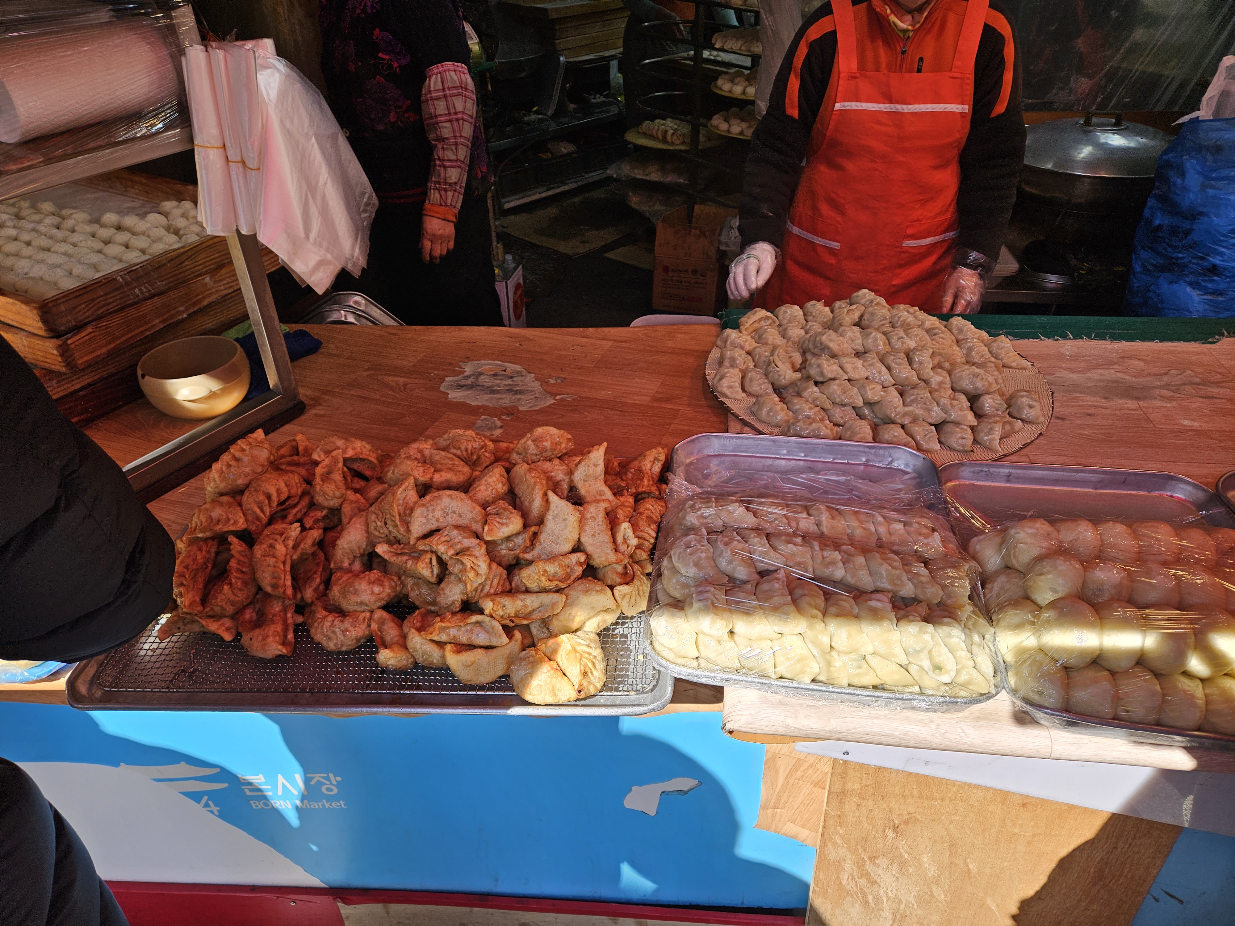 만두 외에 찐빵, 술빵, 도넛츠 도 팔고 있고요, 만두는 종류에 관계없이 6개에 5,000원, 10개 8,000원이에요